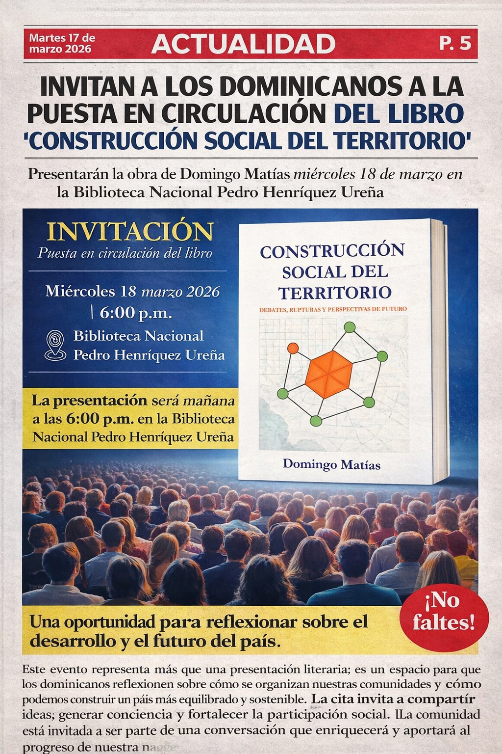La puesta en circulación del libro “Construcción Social del Territorio” de Domingo Matías hoy, 17 de Marzo 2026, es una oportunidad para abrir un diálogo necesario sobre el presente y futuro de la República Dominicana. Más que un evento literario, se trata de un espacio para reflexionar sobre cómo se organizan nuestras comunidades y cómo podemos construir un país más equilibrado y sostenible.